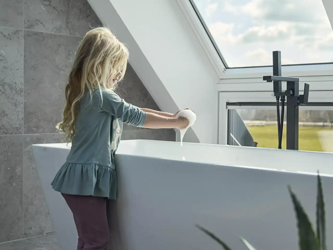 When installing a roof window, remember to choose a solution that is tailored to the requirements of a specific room. Hot baths fill the bathroom with moisture, so a window with a moisture-resistant polyurethane cover is best. The white VELUX polyurethane pivot roof window is distinguished by its modern design, which is easy to wash and dry.